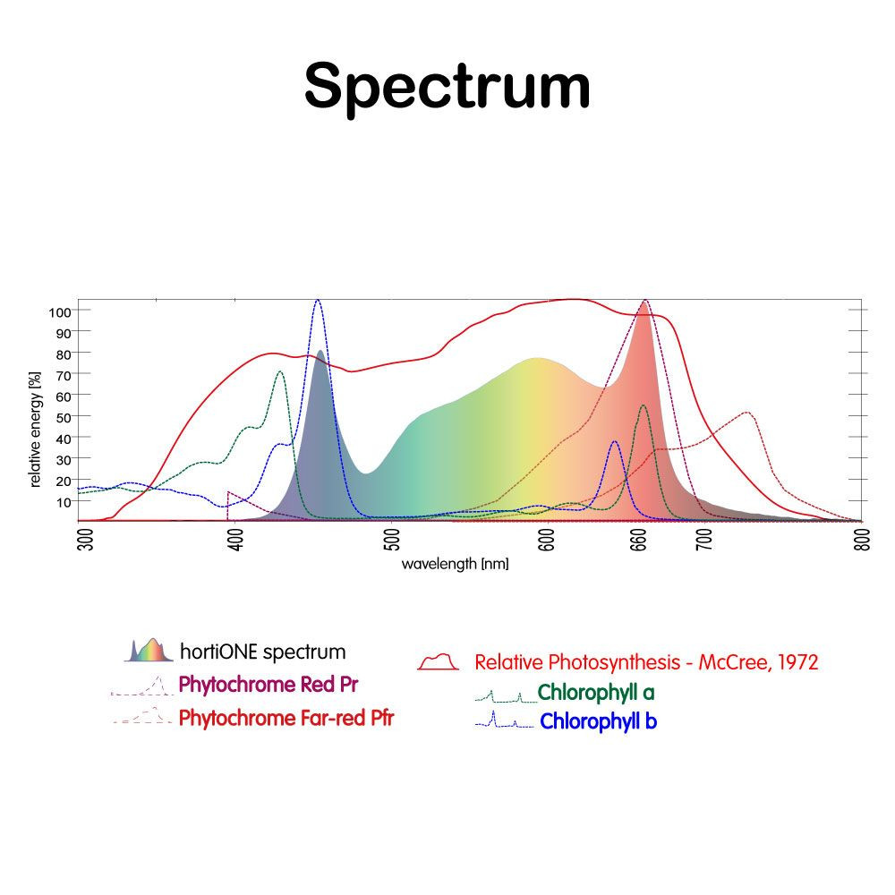 Vďaka svojej dĺžke je možné dosiahnuť rovnomerné osvetlenie na veľkých plochách. Hybridný dizajn s vysokovýkonnými LED diódami MID-Power (platforma 3030C) s plným spektrom a teplotou 4000 K v kombinácii s vysokovýkonnými LED diódami OSRAM (660 nm) pre dobrú účinnosť a perfektné kvitnutie.